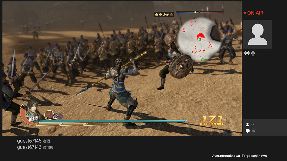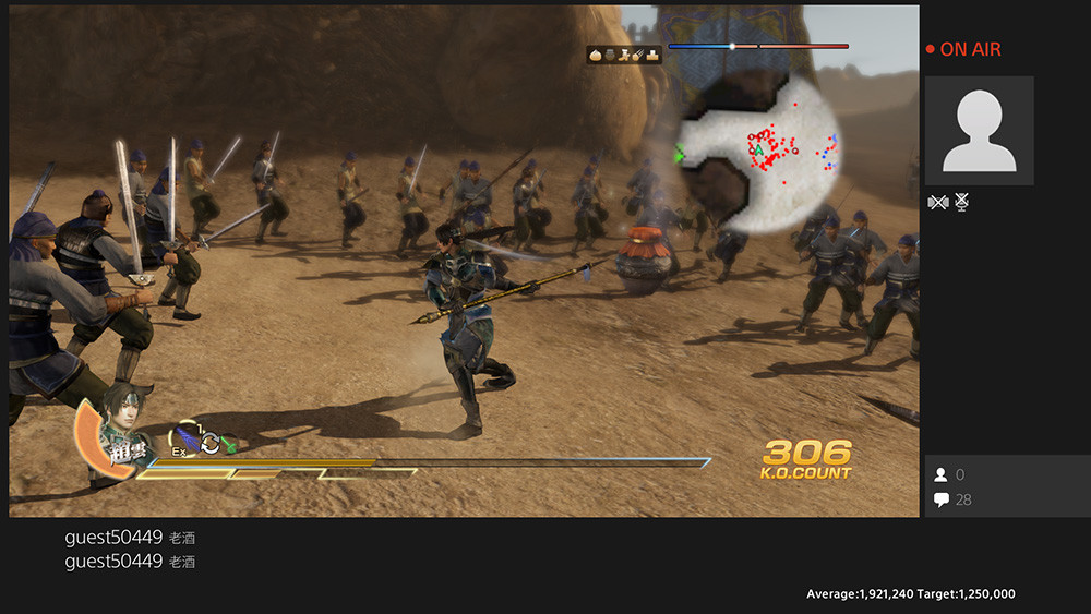 ライブ配信では視聴者もゲームに参加!PS4のブロードキャスト機能によってゲームプレイをリアルタイムでライブ配信することが可能。本作では、ライブ配信中に視聴者から送信されるコメント内容に応じて、体力を回復する肉まんや無双ゲージを一気に溜める老酒を出現させたり落石を発生させて援護するなど、ライブ配信を観ているユーザーがプレイヤーを直接サポートできるほか、敵の数を増やして手応えをアップさせるといった楽しみ方も可能です。