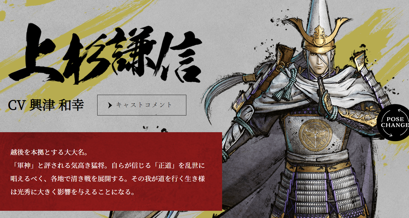 越後を本拠とする大大名。「軍神」と評される気高き猛将。自らが信じる「正道」を乱世に唱えるべく、各地で清き戦を展開する。その我が道を行く生き様は光秀に大きく影響を与えることになる。