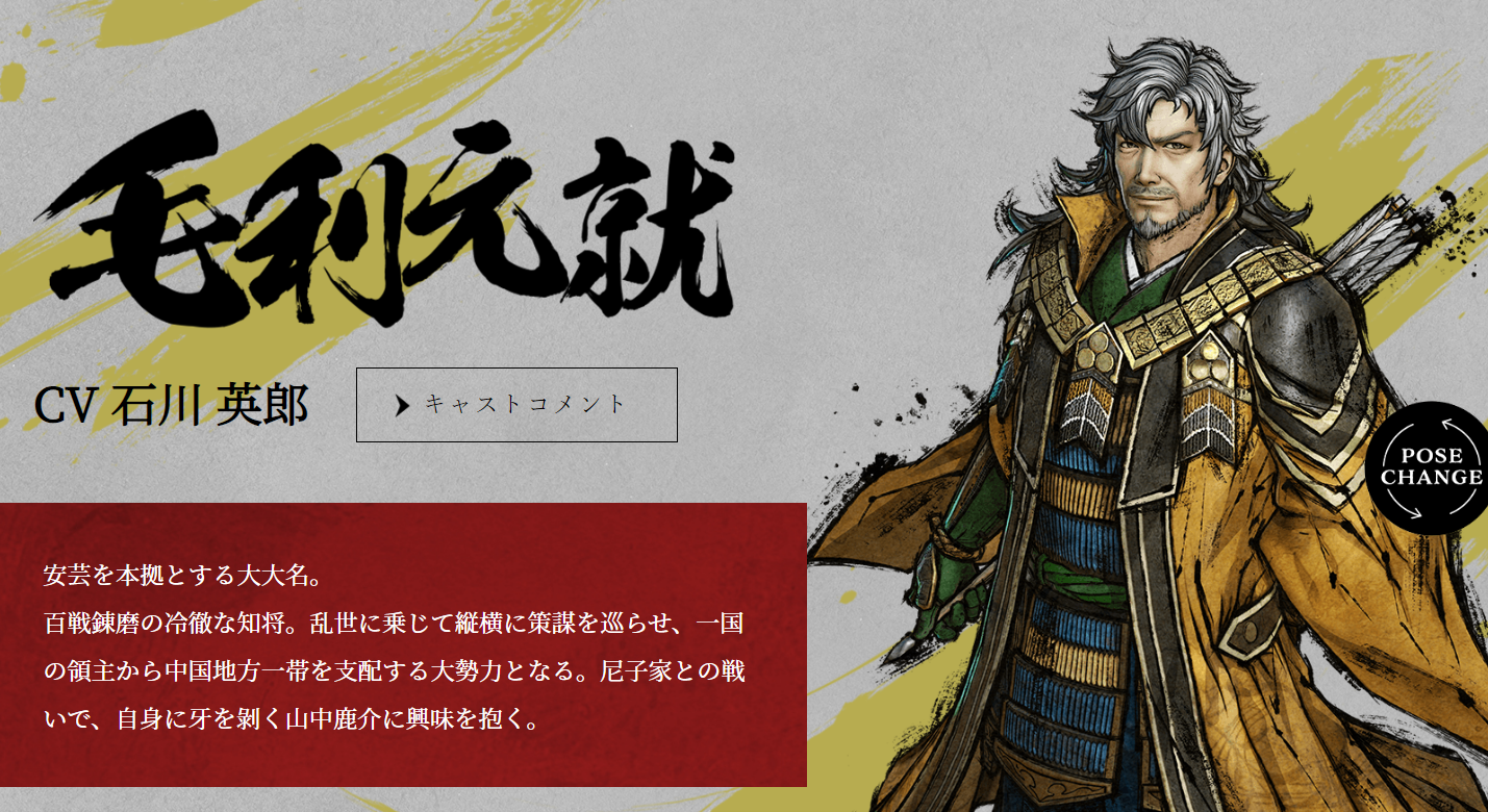 安芸を本拠とする大大名。百戦錬磨の冷徹な知将。乱世に乗じて縦横に策謀を巡らせ、一国の領主から中国地方一帯を支配する大勢力となる。尼子家との戦いで、自身に牙を剝く山中鹿介に興味を抱く。